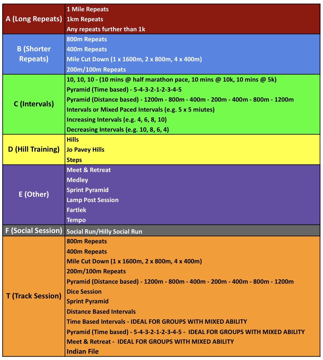 Each group has been assigned a letter from A to F, or assigned the letter T for track, every Tuesday. Coaches who are available will pick a session from the options that are in that category.