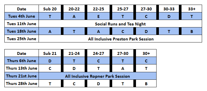 In June, we will be returning to 5 groups on Thursdays – Sub 21, 21-24, 24-27, 27-30 and 30+. Each group will do their own speed session starting from the club. As the range in paces increases slightly in comparison to Tuesday’s groups, the sessions will be more timed focussed on Thursdays. Two groups will be assigned the track each Thursday.