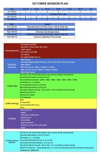 Thursdays will primarily feature three pace groups (Sub-24, 24β30, and 30+) each doing their own timed interval session. Likely session options for Thursdays are shown in the bright blue box on the plan.